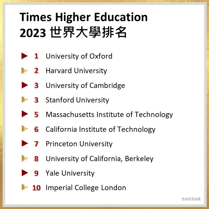 英國 #泰晤士高等教育 THE Times Higher Education 在2022.10.12公布了 2023 #世界大學排名,前10名依然由英美大學包辦,含3所 #英國大學 及7所 #美國大學 。英國 #牛津大學 已經連續七年蟬聯榜首,#哈佛大學 站穩第二,#劍橋大學 往前進步2名位居第三,第四名為 #史丹佛大學,第五名仍舊是 #麻省理工學院,第6至10名依序為 #加州理工#普林斯頓大學#加州大學柏克萊分校#耶魯大學 以及 #帝國大學#芝加哥大學 則跌出前十而落在第13位。